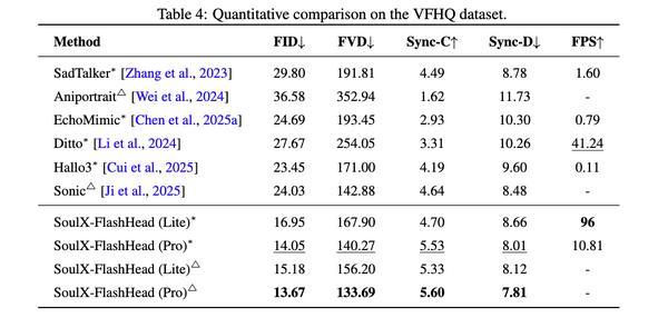 可以或许实现0.87s亚秒级超低延时、32FPS高帧率,让及时数字人模子实正走到了消费级终端上。可以或许正在单张消费级显卡( RTX 4090 )上跑出96FPS的工业级速度,这款1.3B参数的轻量化模子,大幅领先此前相关工做,口型精准捕获:面临野外复杂场景(VFHQ),为行业供给新的及时数字人方案。Soul AI Lab开源了及时数字人生成模子SoulX-FlashTalk,且不抢占焦点衬着资本。